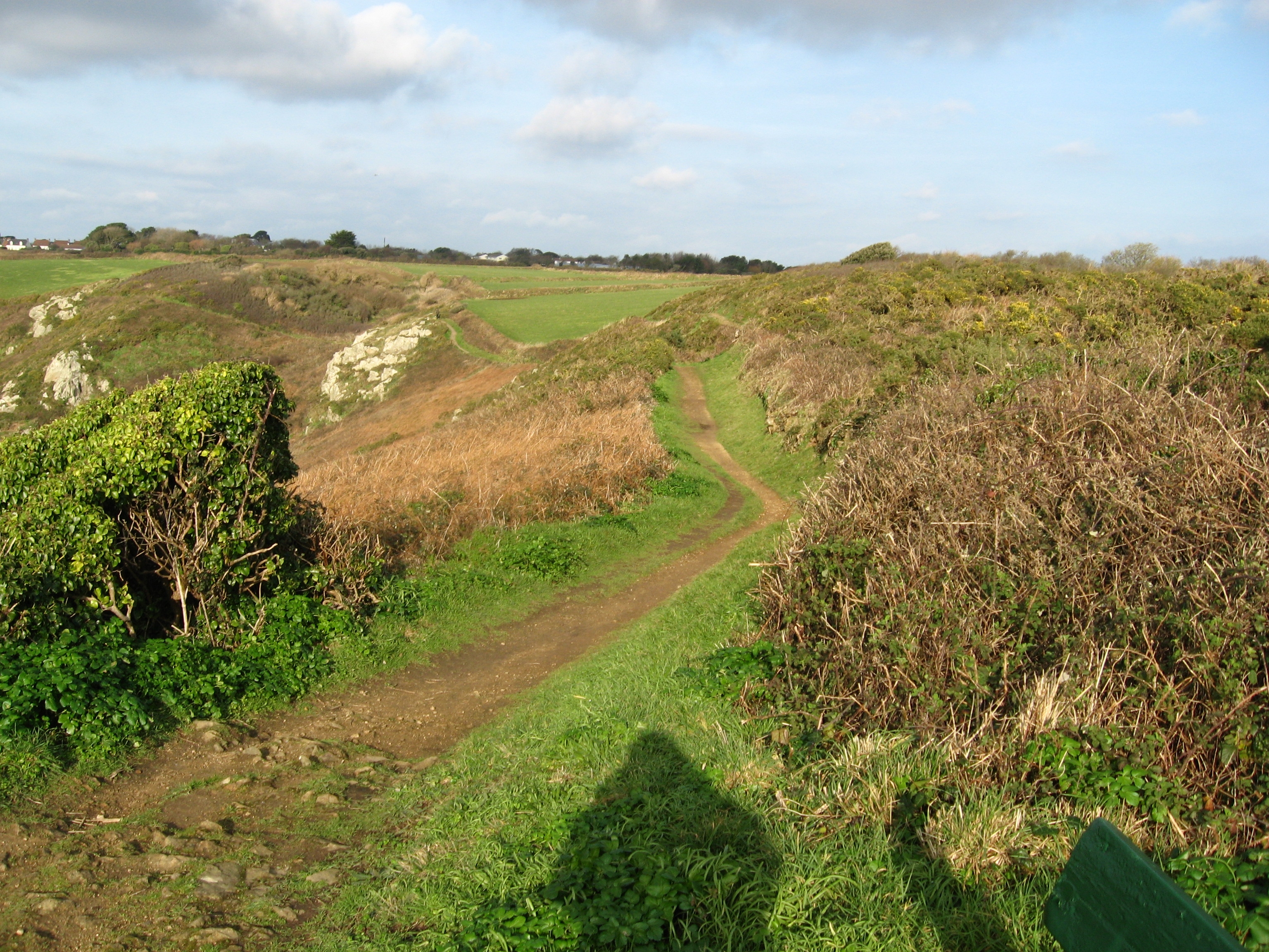 Once the relatively moderate terrain towards Corbierre had been covered the more demanding undulating pathways really start to test the knee and thigh joints. There was no respite from the conditions as we headed for Pleinmont Point and it was only when we reached Les Tielles that it seemed the pathways became less daunting. Another difficulty on this homeward stretch is that you become much more exposed to the elements, and it was quite noticeable that the wind was getting up and we could feel rain in the air. We did in fact get quite a battering with the very strong wind on the exposed top of Pleinmont and it was only when we made our descent to the Fairy Ring that we got some respite from the difficult conditions.