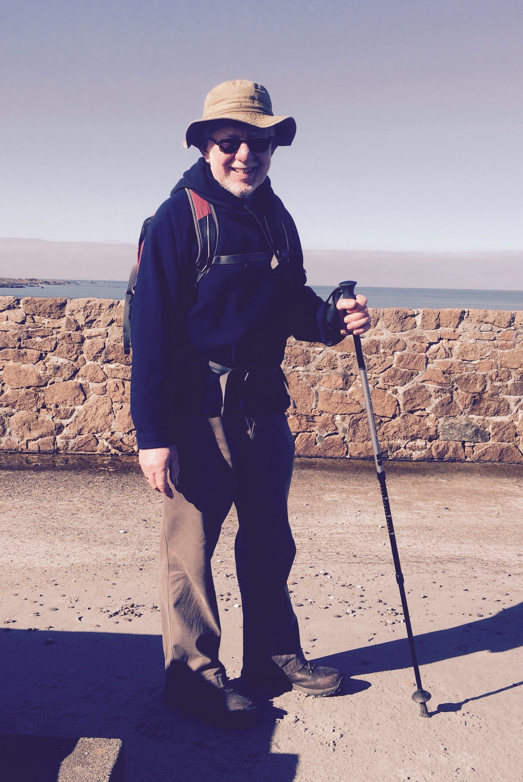 The weather was still bright and sunny as we approached Cobo Bay, the glorious sand looking pristine in the winter sunshine. Walking on the beach at Cobo always makes me think of fish and chips and sitting by the sea wall eating them! Saline Bay was our next stop for a drink and some refreshments – just wonderful seating on the rocks and watching the world go by – and Anne P decided to leave us at this point.