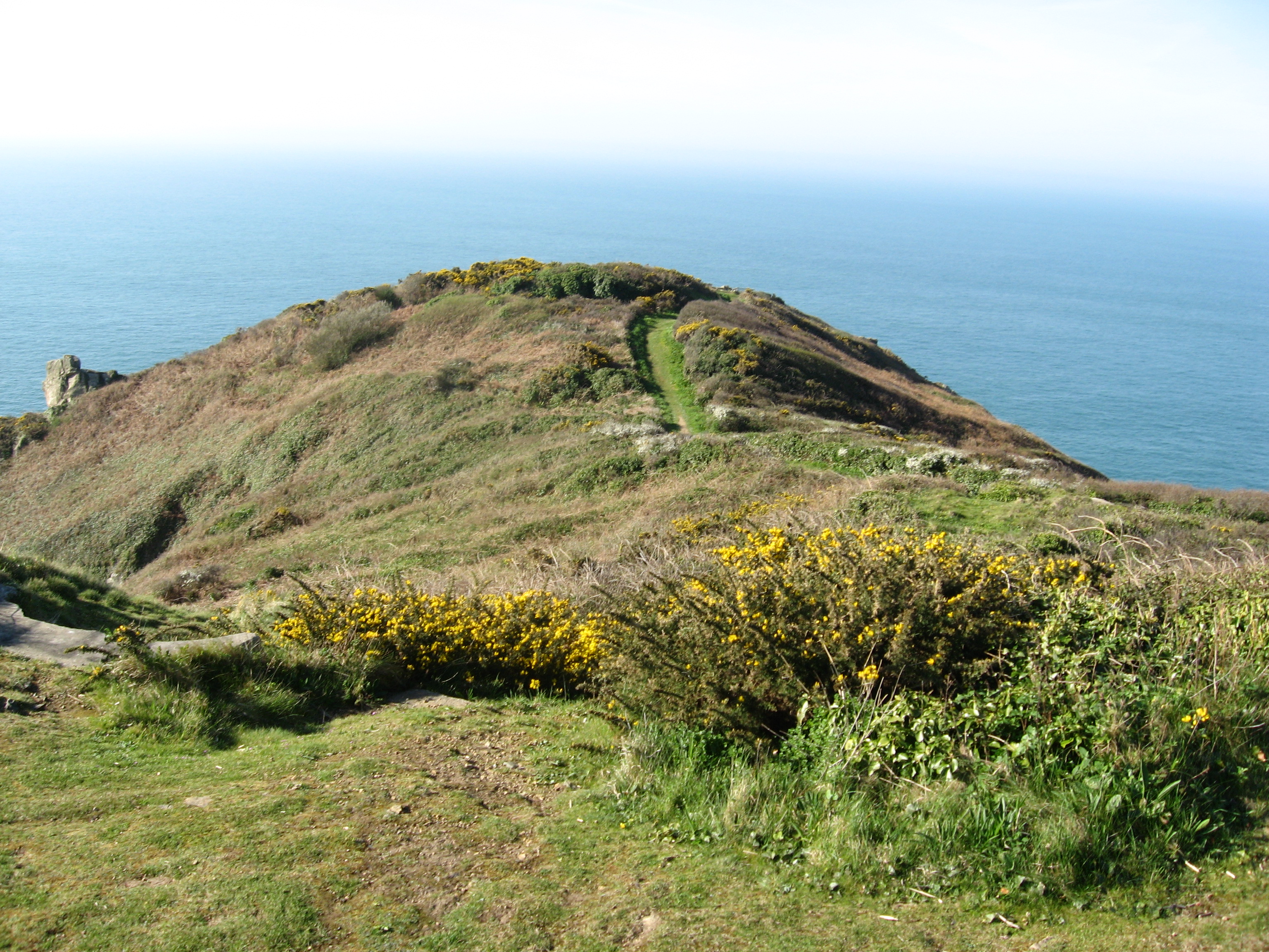The sun was bright as we left Icart to commence the walk and the Spring colours were just so vibrant along the cliff faces with the yellow flower of the gorse clearly the most prevalent colour in sight. The glittering on the surface of the sea was also spectacular and I can honestly say there was no where else I would rather have been with such superb conditions as this to walk in. No matter how good the weather is the physical demands of the steep steps do not get any easier, and by the time we were on the upper cliff path heading towards Petit Bot Bay, we were feeling the our leg muscles and breathing much deeper.